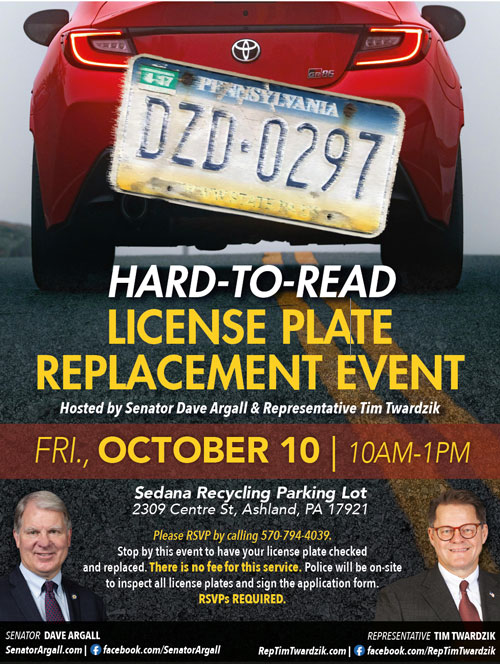 Do you have a damaged or hard-to-read license plate? Join Sen. Dave Argall and me for a license plate replacement event Friday, Oct. 10, from 10 a.m. to 1 p.m. at the Sedana Recycling parking lot, 2309 Centre St., Ashland.